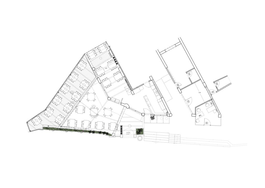 Η σύνθεση βασίστηκε σε καθαρές γεωμετρίες και φυσικά υλικά όπως το ξύλο και το σοβάτισμα σε απαλές αποχρώσεις. Η ανοιχτή διαρρύθμιση της τραπεζαρίας, υπό την προστασία μιας πέργκολας με καλάμια και χειροποίητα φωτιστικά, προσφέρει μια εμπειρία εστίασης που τιμά την απλότητα και τη ζεστασιά του ελληνικού καλοκαιριού.